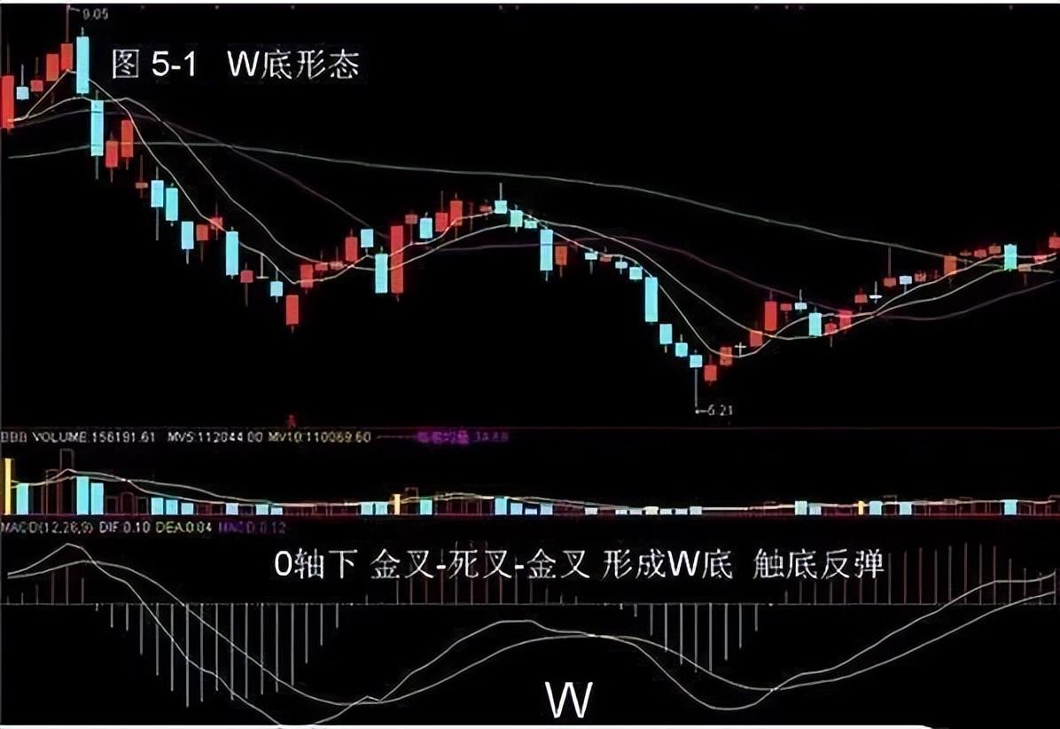 股价下跌行情中,在O轴线下,白线处于某一低点后向上,随后相继出现“金叉”,又出现“死叉”,其轨迹上在一个不同水平线上形成“W底”(双重底)的走势,当再出现“金叉”,既后(右)底出现时,预示见底反弹信号,可积极买入。