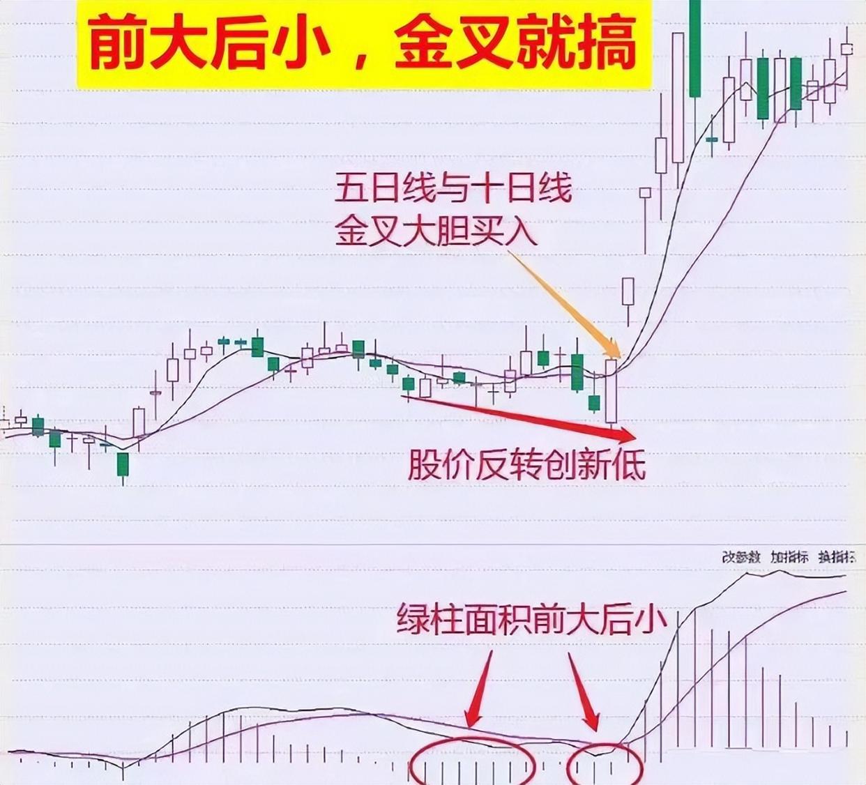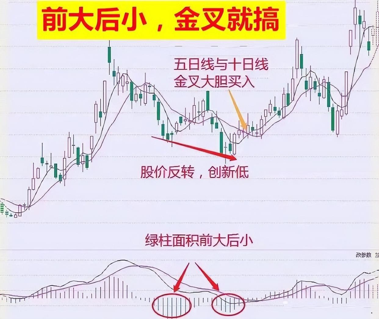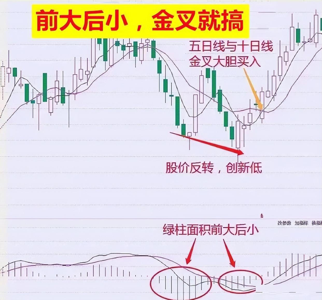 介入口诀:“前大后小,金叉就搞”,市场上大家都是追涨杀跌,然后我这位朋友是反着操作的,股价下行途中,macd绿色柱“先大后小,出现金叉”就是介入机会。意味着下行放缓,空头释放,行情随时反转上扬。