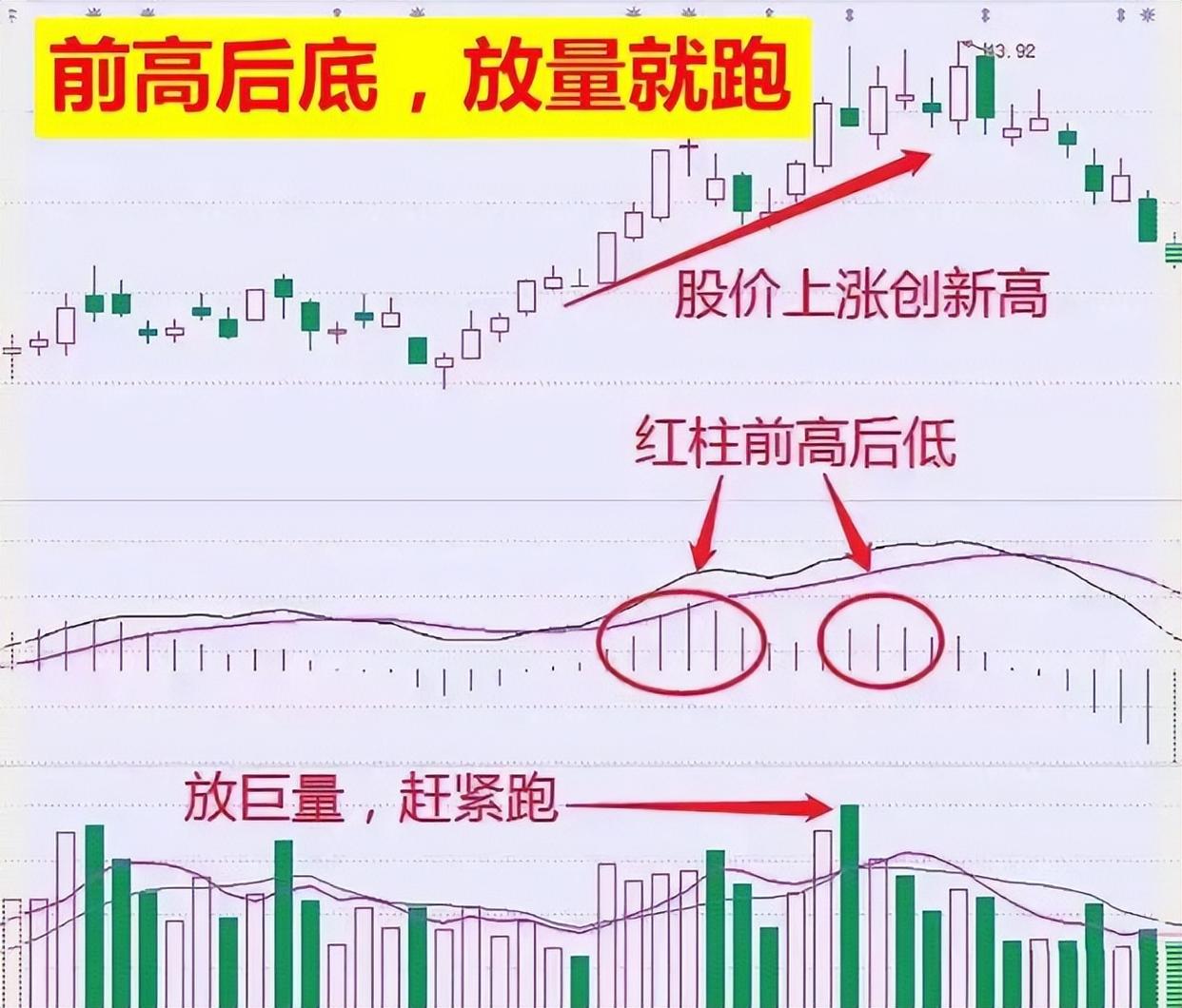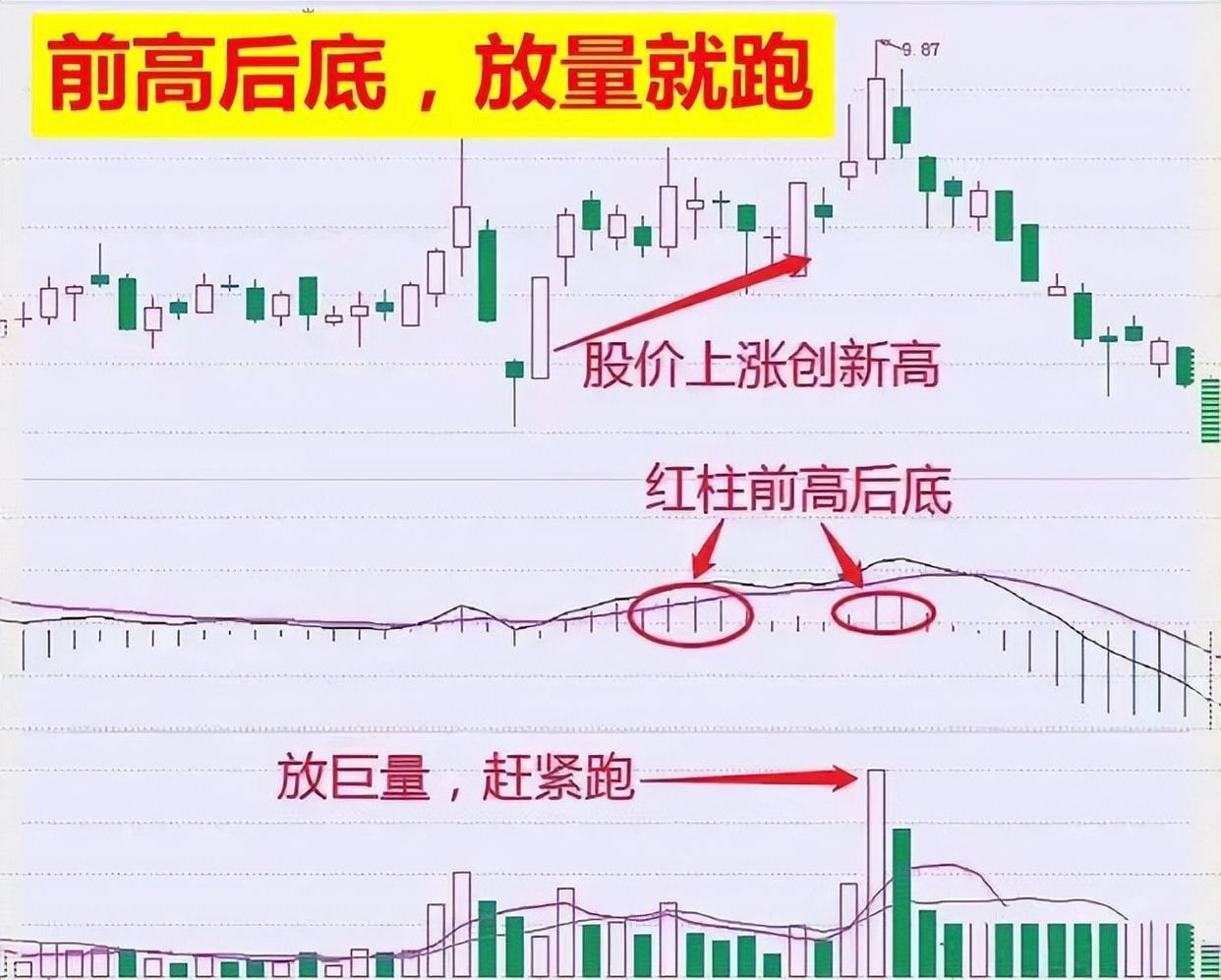 出局口诀:“前高后低,放量就跑”其实呢?这就是股价在上扬的过程中,股价不断地创新高,但是macd的能量柱逐渐地变小,红绿柱形成前高,后底的,且成交量放大,说明主力出逃,就是要离场的时候。