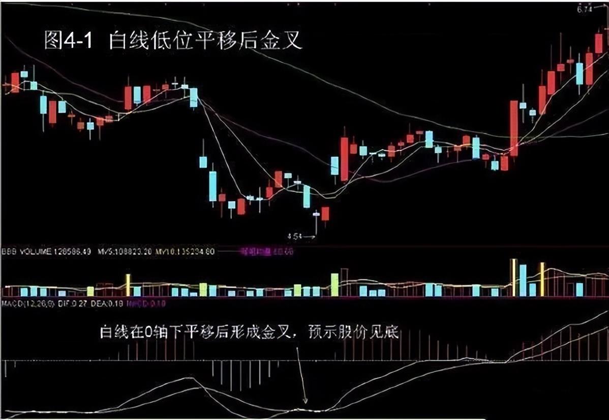 在O轴下,白线处于较低位置且不再下行,开始呈横向水平移动,而此时股价继续处于下跌状态,这已开始预示股价见底,一旦白线平移结束,开始向上“抬头”形成金叉,是买入股票的最佳时机。