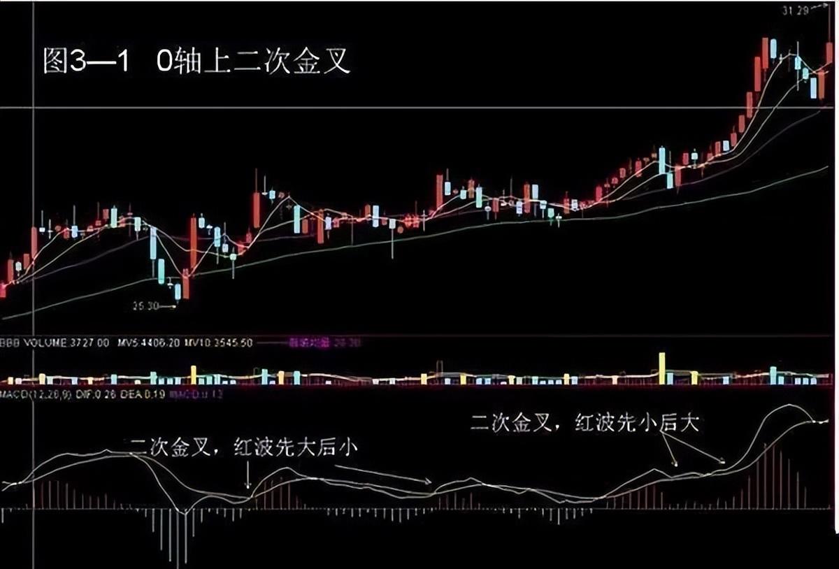 在 0轴线上,白黄线出现“金叉”后,又出现“死叉”,但不下穿O轴线,几日后在O轴线上再次出现“金叉”,为“轴线上二次金叉”。此形态是主力洗盘所为,短 暂盘整后,股价将上扬,可视为积极介入的信号。如果第一次“金叉“后的红波小(红柱短且不长),第二次红波大预示较好的买入时机。
